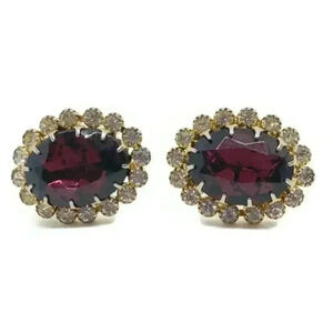 Vintage Earrings BIG PURPLE Faceted Rhinestone Clear Stones Prong Set Clips. Thesexare gorgeous. The deep purple stone is quite large and is surrounded by a row ofxsuper sparkly clear chaton stones. Set with large dog tooth prongs. Shipped with USPS First Class Package.