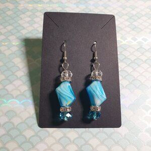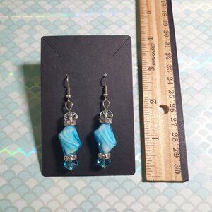 Elegant dangle earrings featuring a blue and white swirled bead design complemented by crystal accents. Lightweight for comfortable wear and suitable for various settings.