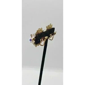 Vintage Earrings Clip Gold Filigree AB Crystal Dangle Soft Touch 1950 Fancy