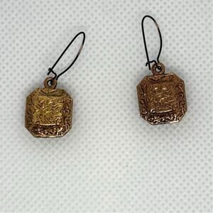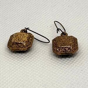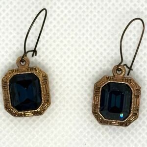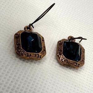 Vintage Earrings Dangle Gold Tone Blue Glass Stone Engraved Filigree