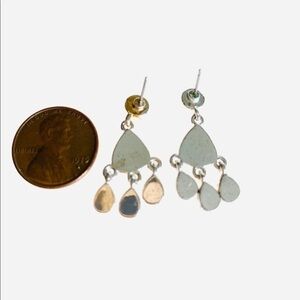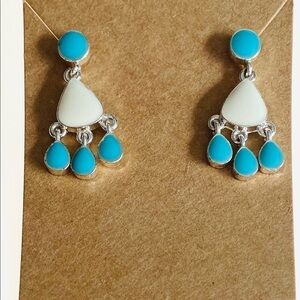 This is a very adorable pair of vintage earrings with dangles. The center is cream white and dangles are teal colored. The size is 1 1/4” x 1/2”.