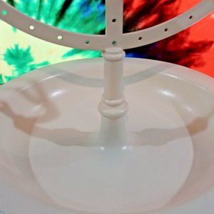 Great for displaying your favorite jewelry. Many holes for dangle earrings, hoops, and studs. Attached bowl for jewelry and accessories. Off-white metal with black velvet bottom. Measures approximately 10"x7". For home or retail use.