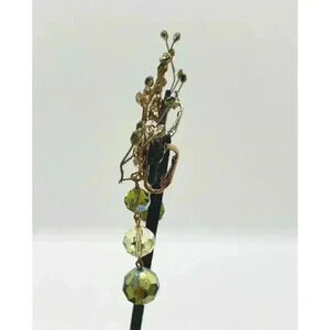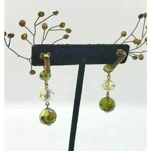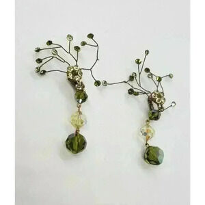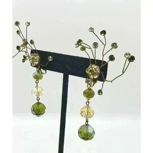 Fantastic vintage clipearrings with green, citrine yellow and clear rhinestones in a very atomic Sputnik era design. Very long twisted wire spikes with rhinestones glued to a cup at the end. A rhinestone gmflowercenter with dangle drops.