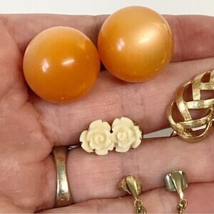 Vintage Earrings A Set / Lot of 4 Pairs; Cute Cottagecore Etched floral beaded Dainty Drop Earrings, Statement Thermoset Ball Studs, Feminine Rose Studs, and Avon Signed Basket Weave Braided Brushed Gold Tone Climber Clip On Earrings.