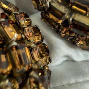 Vintage signed Sherman earrings composing of Topaz and Champagne Color rhinestones, baguettes and teardrops in clear. Clips work great. Some loss of plating at the back only visible by englargment.