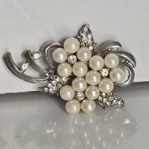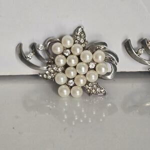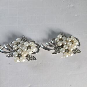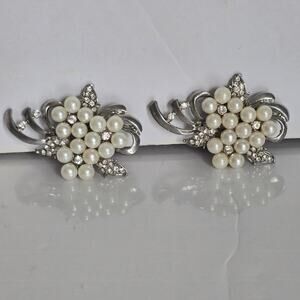 Vintage Earrings Women's Faux Pearl Cluster Rhinestone Silver Tone Clip On Glam