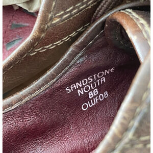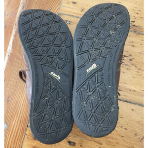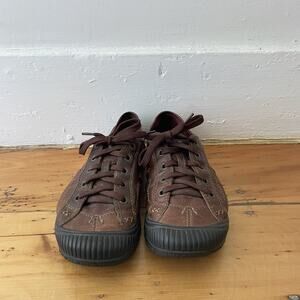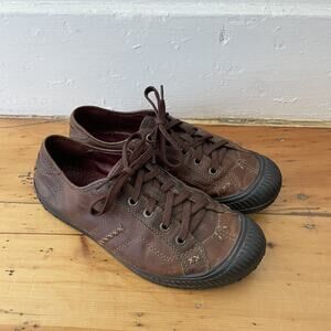 Vintage Earth leather sneakers in rich brown with sturdy rubber soles and classic low-top lace-up design. Unique contrast stitching and durable construction give them timeless retro appeal. Some oxidation visible around the metal grommets and light general wear consistent with age, but overall great pre-owned condition. Tread is still in excellent shape, making these a stylish and functional pair for everyday wear. Perfect for vintage fashion lovers, casual streetwear looks, or collectors of retro Earth shoes.