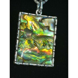 Vintage Earth-Toned Abalone Shell Pendant Necklace 20 Inch Chain Silver Tone Very beautiful light reflection!