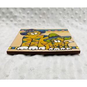 Vintage Earthtones Southestern Cat Handcrafted, Trivet/Home Decor/Wall Accent. (2006). Cute tile features multi-color cats with a southwestern flair, hand-crafted red-mud tile, sturdy cork backing allows wall hanging. Measures 6 x 6, 1/2" wide. In like new condition, in glass display cabinet, no cracks or chips. Comes from a smoke free, pet free home.