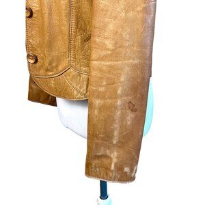 Given the age, this jacket is in good condition with no minor cracks or tears in the leather or lining material. There are a few areas of spots on the jacket, as shown in the photos. There are also areas, where the color is uneven - most notably the sleeves - with light areas.There is also a darker spot on the right sleeve, and surface scratch marks.