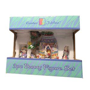 New never opened easter bunny 3 piece figurine. Vintage Kmart Easter Decor. Colorful egg shaped home with tree and cute bunny rabbits. Perfect for your up coming easter holiday decor. Open to reasonable offers and bundle deals
