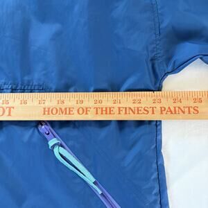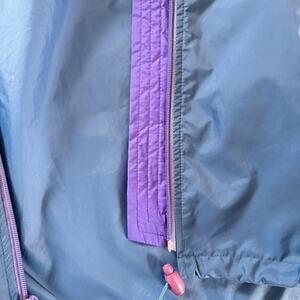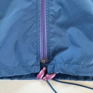 This Vintage 90s Eastern Mountain Sports nylon blue rain jacket in size large is a classic outdoor garment ideal for hiking and other outdoor activities. The chest measures 46 inches. Made from lightweight and water-resistant nylon, this windbreaker features a full zip closure, zipped pockets for convenience, and a hood for protection against the elements. The hood zips inside the collar and there are toggles to tighten the waist. The length is 26.5 inches and comes in a solid blue color with purple accent zipper details offers both style and functionality, perfect for a 90s-inspired outdoor look. Made in Malaysia, this jacket is a great addition to any vintage- or outdoor-inspired wardrobe.