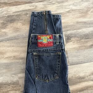 Classic vintage Echo Jeans featuring a flattering high-waisted fit, tapered legs, and zippered ankle hems. Made from durable washed denim with contrast yellow stitching for that true 80s/90s retro vibe. A perfect find for collectors of unique vintage denim.