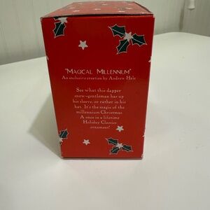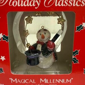 See what this dapper snow-gentleman has up his sleeve, or rather in his hat. It's the magic of the millennium Christmas. a once in a lifetime Holiday Classics Ornament.