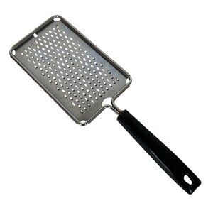 Durable and easy-to-clean stainless steel grater with an ergonomic black handle, suitable for grating cheese, vegetables, or zesting citrus fruits.