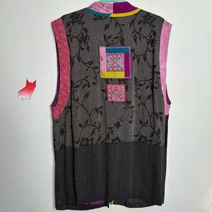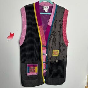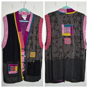 Vintage Eclectic Mixed Material Patchwork Vest Faith by Celia Forrester, Size XL. In very good preowned condition, no flaws.