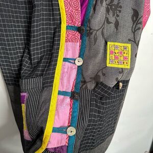A vintage 1990s Y2K quirky Clarissa or Blossom style vest! Longer length makes a great lagenlook art to wear piece that can be worn with so many different styles. Mixed fabric types, embroidery, beading, fun chunky buttons as well. 100% Rayon, made in Indonesia. What a gem!