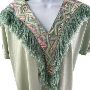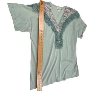 Vintage Eclectic Western Bohemian Aztec Sage Green Top with Fringe size Medium. Southwestern print. 50% Cotton 50% polyester Made in the USA Joanie W
