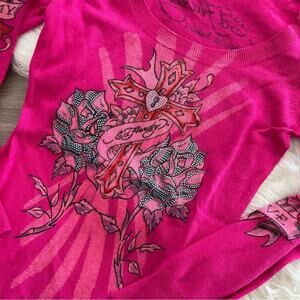 Vintage Ed Hardy Magenta Pink Rhinestone Tattoo Scoop Neck Wool Tunic Sweater M