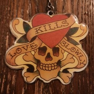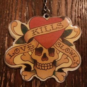 Vintage Ed Hardy key chain with authentic "Love Kills Slowly" writing and design