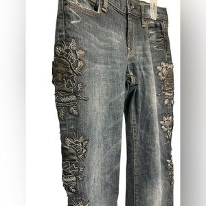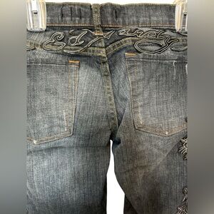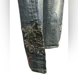 Vintage Ed Hardy skull embellished jeans. Size 27. Skull w floral embellishment down both sides. Some pleather on skulls wearing off but most still in tact. Ed hardy across lower back.