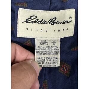 This Vintage Eddie Bauer Barn Chore Lined Jacket in size L is a classic and durable outerwear piece for men. Made from cotton corduroy with a polyester lining, this jacket features a button closure, a pointed collar, and a mid-length design perfect for casual and workwear occasions. The solid blue color and timeless style make it a versatile addition to any wardrobe, suitable for all seasons. The brand's reputation for quality and the jacket's various features like a lined interior and regular fit ensure both comfort and functionality for outdoor activities or everyday wear.