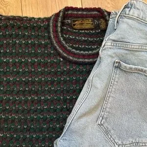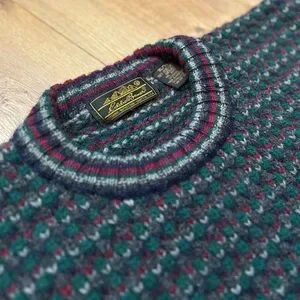Classic vintage sweater from Eddie Bauer featuring a timeless birdseye-style knit pattern and heavyweight Shetland wool construction. A cozy, durable piece with that classic outdoorsy vintage aesthetic.