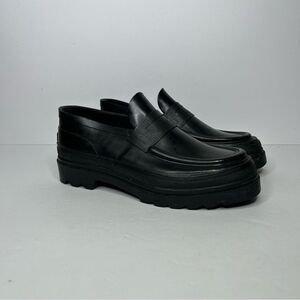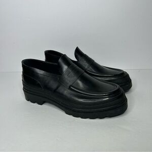 These black loafers feature a sleek slip-on design with a wide, rounded toe box and a smooth vamp. The chunky platform sole adds height and style, while the rugged tread ensures a firm grip. Crafted with a leather-like material, these shoes combine durability with a modern aesthetic.