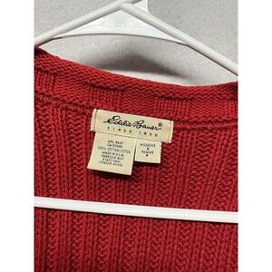 This Vintage Eddie Bauer Cable Knit Sweater is a classic red vest cardigan in women's size small, made of 100% cotton with a sleeveless design and a v-neckline. The sweater features a button accent, a solid pattern, and a cable-knit style, perfect for the winter, fall, and spring seasons. With its 90s theme and breathable fabric, this sweater is a timeless piece that embodies the iconic Eddie Bauer brand and its quality craftsmanship, hailing from the United States.