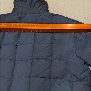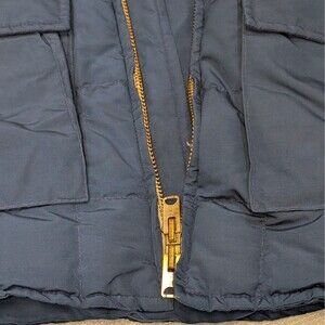 The Vintage Eddie Bauer Down Blizzard Proof Jacket Coat Parka for Men features a classic design with a faux fur stand-up collar, zip closure, and multiple pockets for functionality. This mid-length parka is perfect for casual winter occasions. The Eddie Bauer brand ensures quality and the down insulation keeps you warm during outdoor activities like hiking. This vintage jacket in a solid navy blue color adds a touch of style and historic charm to your wardrobe.