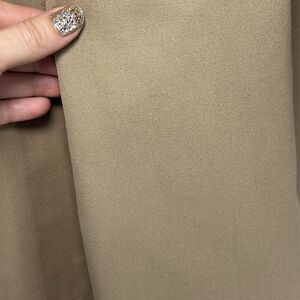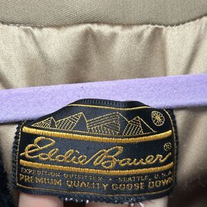 The Vintage Eddie Bauer Khaki Goose Down Trench Coat is a stylish and functional outerwear piece perfect for casual occasions. Made of polyester with a warm down insulation, this long coat features a fur-trimmed collar, belted waist, and button-up closure. With a classic trench coat style and a vintage touch, this piece exudes a rugged Americana theme ideal for outdoor activities like hiking. The beige color and Eddie Bauer brand add a timeless appeal to this quality piece from the United States.