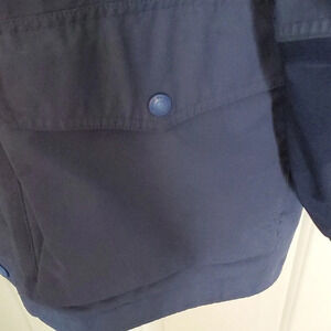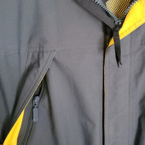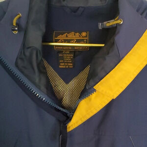 Eddie Bauer Gore-Tex Jacket - Made with 100% polyester outer shell material. Blue color with yellow accents, full zip up closure, 2 zipper pockets on the top, bottom has 2 large snap pockets, inner pockets, waterproof, lightweight, breathable and water-resistant. The lining material is 100% nylon and the insulation material is made of polyester. Great jacket for any outdoor activity