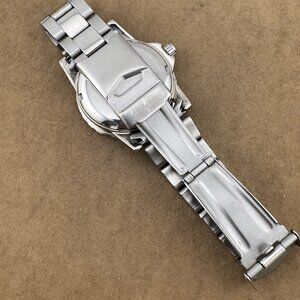 Vintage Eddie Bauer Men's Diving Watch Model LG 0133 Interchangeable Reg 42102 5 ATM 165 feet Sharp Black Dial Luminous Hands and Markers Sweeping Second Hand. Recessed Mineral Crystal, Working Silver Tone 1.5 inch diameter without crown. Stainless steel back and 7.5 inch Link Bracelet Light 4.3 ounces fully functional rotating 60 Minute Bezel new battery serviced sanitized comes with Wood Box, Brown and Black Leather Straps