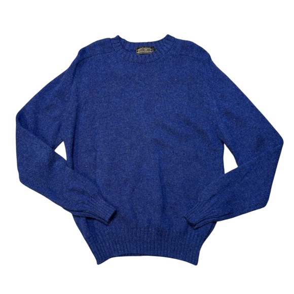 Vintage Eddie Bauer Men's Rich Blue Crewneck Sweater; Classic crewneck design. Rich blue color. Ideal for layering. The item has been used and worn a lil more than a few times. There is some wear and tear such as 2 small holes on the front of the item, item also is a itchy vintage material- to make it unitchable, layer with a underneath shirt. Overall the item has plenty of life left.
