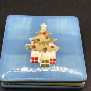 This Vintage Eddie Bauer Set of 4 Holiday Coasters features porcelain square coasters with festive holiday designs. Each coaster is equipped with felt feet on the bottom to protect surfaces from scratches. Perfect for adding a touch of seasonal charm to your table while keeping it safe from spills and heat.