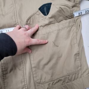 Cool vintage Eddie Bauer chore coat! Shorter fit with lots of pockets and a plaid lined interior. Shoulders have extra material for articulation. Piece is in sturdy condition, just has some staining on the neck that wouldn't wash out and it is missing the button for one front pocket. Size medium