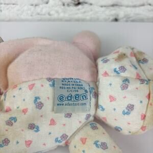 Vintage 80’s Eden Pink and White Plush Baby Doll. Cute plush doll with pink and white outfit. Features a charming design with a bow on the head. In good vintage condition. Some staining here and there due to age. Measurements approximately 9” X 8”.