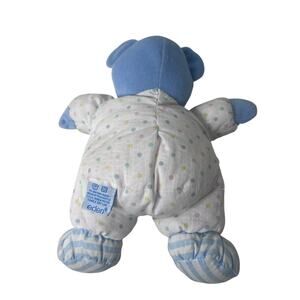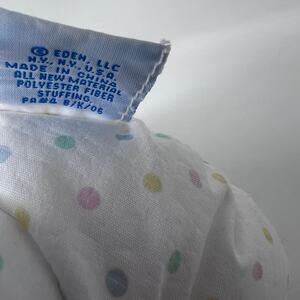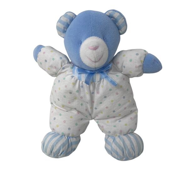 Vintage Eden Plush Teddy Bear Blue Velour Face Polka Dots Stripes Rattle Lovey in gently preowned condition from a smoke-free home - freshly laundered, light wear/discoloration - hard to tell from photos.