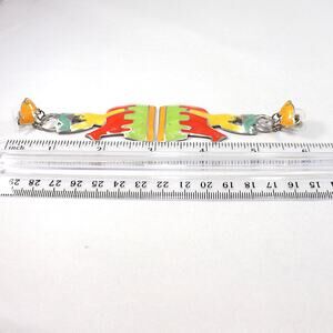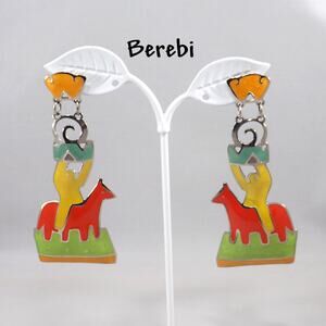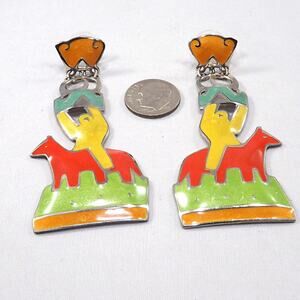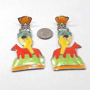 This is a bold and colorful pair of vintage Edgar Berebi enamel earrings from the 1980s. Designed in Berebi’s iconic statement style, these long earrings feature a vibrant enamel figure in yellow riding a red horse, with accents in orange, green, and blue enamel on a silver tone background. The design captures both southwestern and modernist influences, making them a truly unique collectible pair.