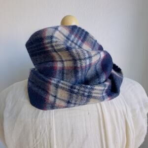 Luxurious vintage Edinburgh 100% cashmere scarf in a classic navy, cream, and red tartan plaid.