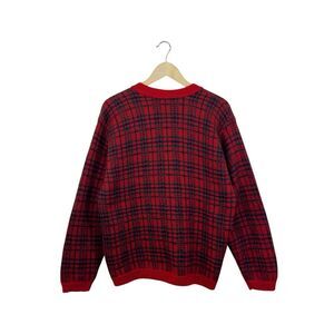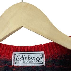 Vintage Edinburgh Large Cardigan Sweater Red Plaid Made In Great Britain Mohair/Polyester/Acetate Womens Long Sleeve Beautiful Quality Classic Retro Beautiful Quality