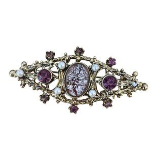 This vintage Edwardian brooch, dating from 1890 to 1910, is a stunning example of classic elegance. Featuring a central silver amethyst foil glass centerpiece, the brooch is adorned with glimmering amethyst rhinestones and simulated pearls. The intricate gold-tone metal setting reflects the refined filigree artistry of the era. Measuring 2 1/2 inches in length, this brooch secures with a historic tube closure, further cementing its vintage appeal. A beautiful and timeless collectible suitable for jewelry enthusiasts or those interested in antique designs.