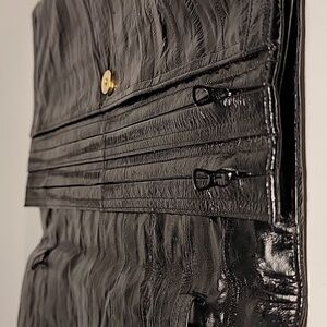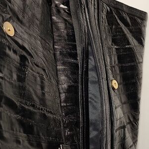 Beautiful vintage genuine eel skin leather clutch purse in classic black. Features a fold-over style with soft leather construction and multiple pockets for storage. Unique textured design adds timeless elegance. Perfect as an evening bag, statement accessory, or collector’s piece.