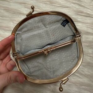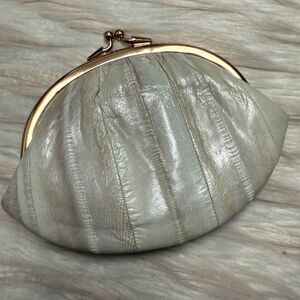 Chic and timeless, this vintage coin purse is crafted from genuine eel skin and features a beautiful pearlescent grey tone with a soft satin diamond-patterned interior. The classic kiss-lock frame in a gold tone adds a touch of retro elegance. Genuine eel skin leather. Satin-lined interior. Kiss-lock closure. Great vintage condition with light signs of wear. Approx. dimensions: 6.5” W x 4.5” H. Perfect for coins, cards, or a minimalist wallet upgrade!
