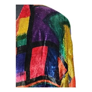 Turn heads in this authentic vintage Effeci multicolor bomber jacket, crafted from soft 100% rayon with a velvet-like texture and bold abstract print. This vibrant piece from the 1980s–1990s features a striking patchwork of jewel tones in geometric blocks, ribbed knit cuffs and hem, and a front zipper with a SAM zipper pull. The relaxed fit and padded shoulders give it a true retro silhouette, perfect for collectors or anyone wanting to add a statement piece to their wardrobe. A rare, wearable art piece that brings vintage streetwear energy.