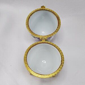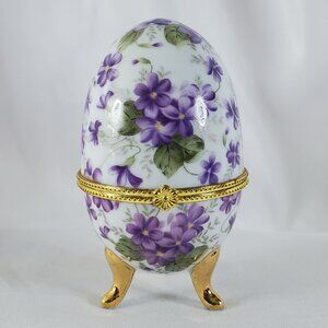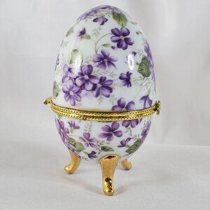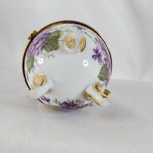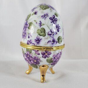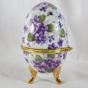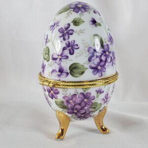 Vintage Egg Shaped Violet Floral Porcelain Trinket Box Hinged Footed Jewelry Box