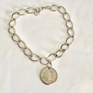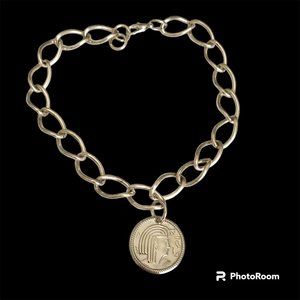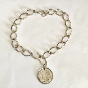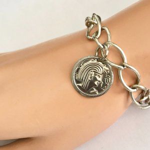 Vintage Egyptian Coin Charm Bracelet Silver Plated 7-10" Chain Egypt Lady Queen