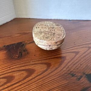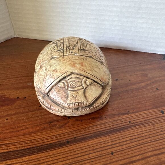 Gorgeous hand carved stone Egyptian scarab. Use it as art, or is a paperweight. Very interesting and lovely to look at. Made of stone, slightly heavy. Solid. Measures about 5 inches by out 3 1/2 inches by about one and a half inches tall. Excellent condition. Please see photos.