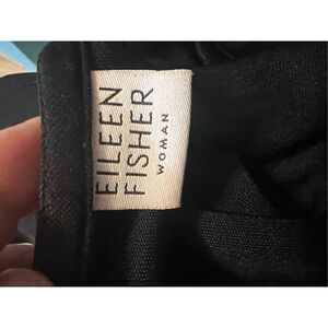 This is an older piece from Eileen Fisher woman with a simple silhouette. It’s a black slinky knit, flattering, and lightweight. There’s a one button closure in the front. No pockets and there are side slits. No fabric tag. I’m guessing silk or viscose to dry clean .