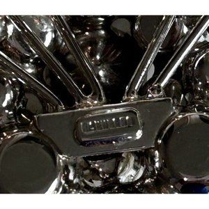 Silver tone Rhodium metal with clear brilliant rhinestones with safety clasp. Dates from the 1940’s. Measures 2.5” wide x 3” high